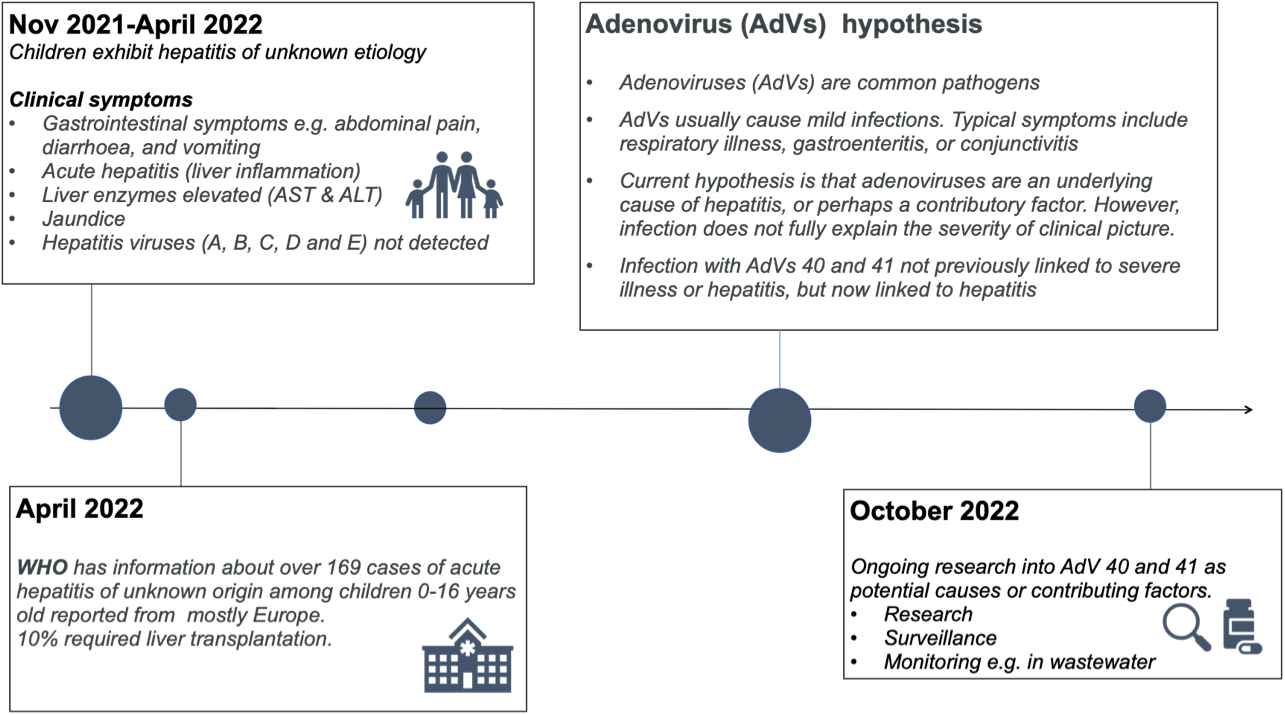 In April 2022, a number of cases of severe hepatitis of unknown origin were detected in children in the UK. These cases were subsequently reported to the WHO International Health Regulations system. The children had not tested positive for any of the most common viral hepatitis types A-E, nor any other known causes of hepatitis UK Health Security Agency, 2022. Since then, multiple countries, including the US, Japan, Ireland, Netherlands, Denmark, and Sweden, have reported similar increases in the number of pediatric patients with hepatitis of unknown origin (Folkhälsomyndigheten, 2022). Research into the possible causes and contributing factors, is still ongoing, as are monitoring efforts focussed on identifying cases.