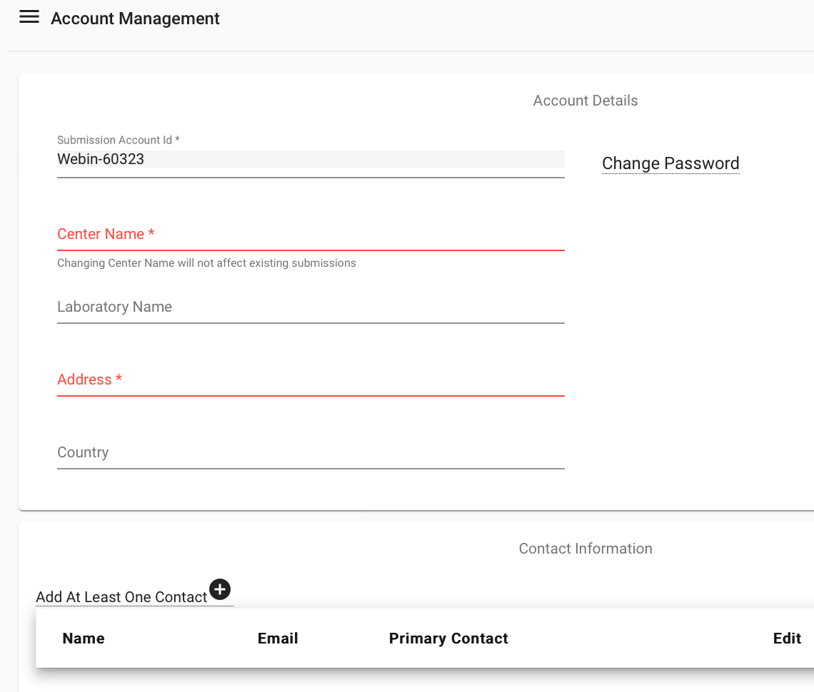 Once you have filled in all of the required fields, you can log in to the submission service. You may wish to add contacts if you are working with other people to complete your submission. You can do this by logging into your account then selecting Home > Manage account. Any contacts that you add will be notified if there are any major changes to data submissions, and they will be listed as contacts on public data.