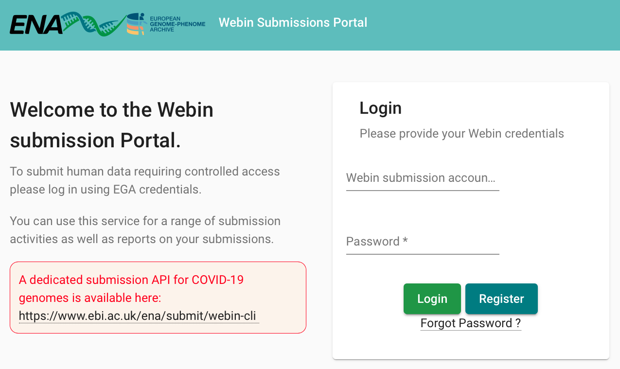 In order to do a submission, you need an account in ENA. To create an account, please go to the ENA submission homepage, click on Register, and fill in the required details.