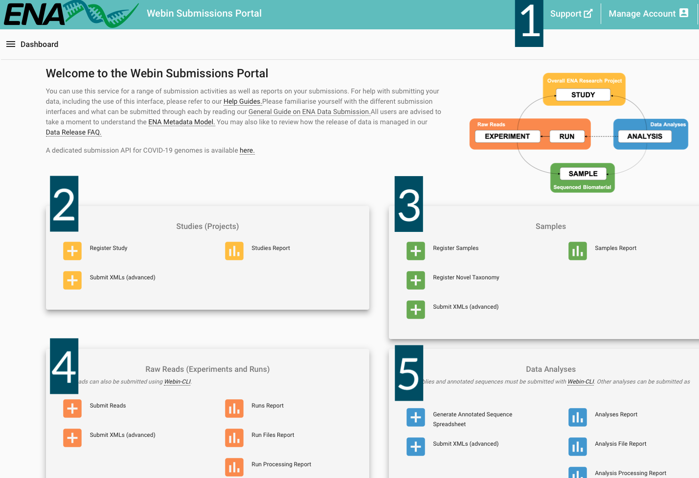 Header Bar (Label 1 in the above figure): Use the Support option to request assistance from the ENA helpdesk. Click Manage Account to e.g. change your contact information or centre name.