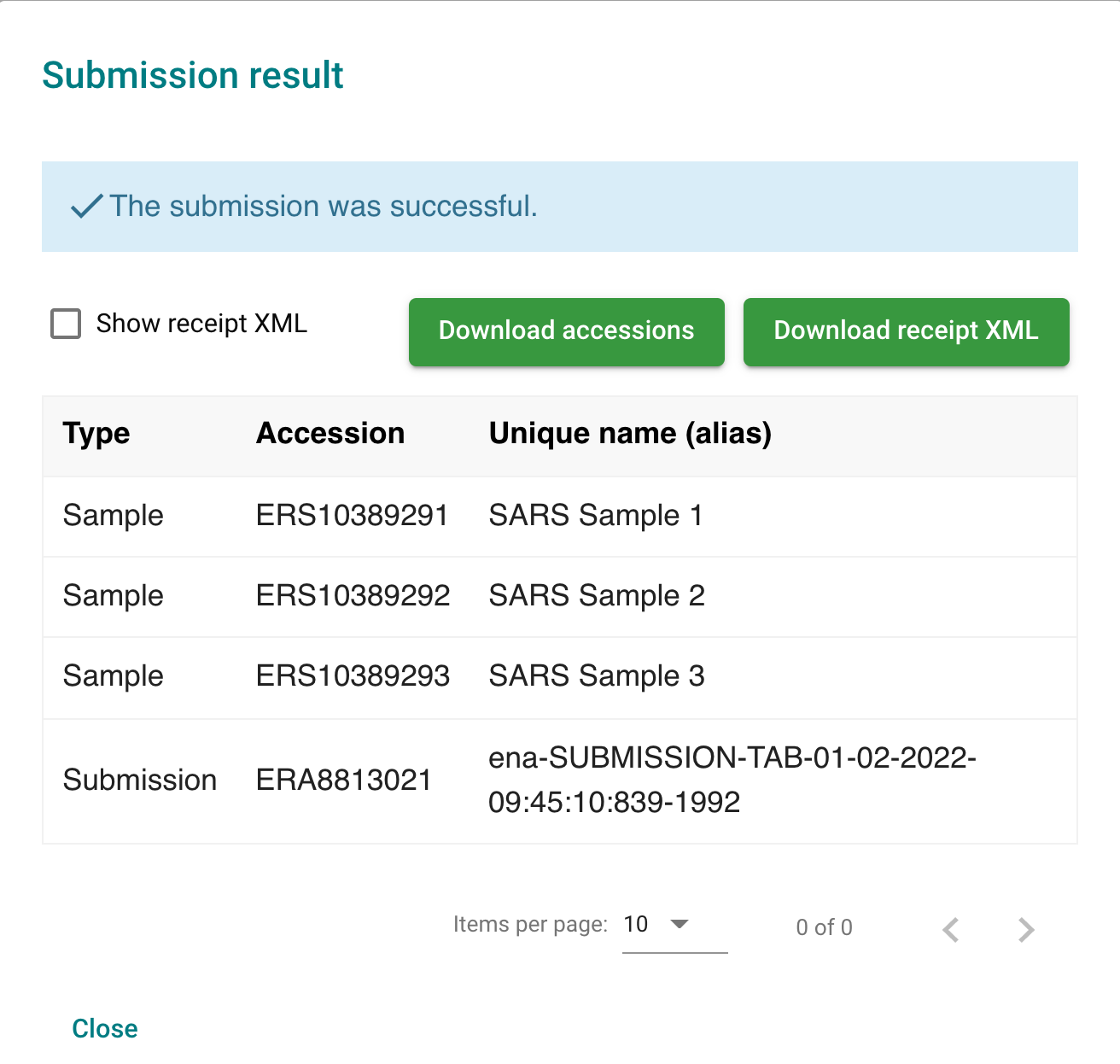 The assigned accession number will also be displayed. As with failed validation, a failed submission results in the provision of directions to a report file that explains the errors.