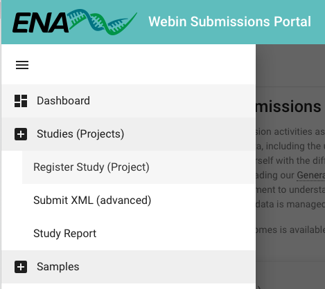 First, log in to the Webin submission portal test service with your Webin username and password. In the top left of the welcome page, there is a Dashboard menu that expands when you click on it. Click it and select Register Study (Project) (as shown in the first picture below), or click on the Register Study option in the Studies (Projects) section on the landing page. The options for ‘Study’ are shown in yellow on the welcome page. See label 2 in the image above to determine where the ‘Study’ options are on the welcome page, and refer to the second image below for a more ‘zoomed in’ image of the options.