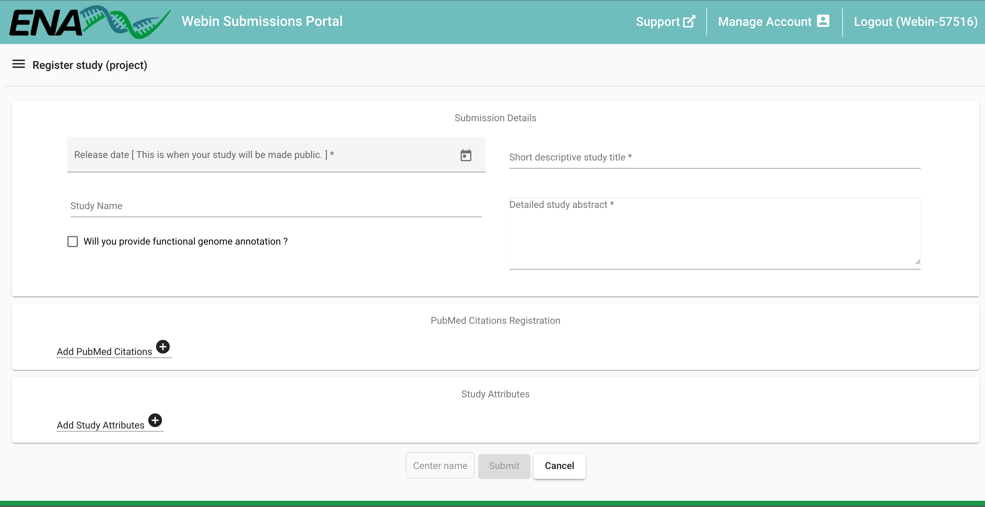 Please see this video by ENA for further guidance on how to register studies using the Webin Submissions Portal.