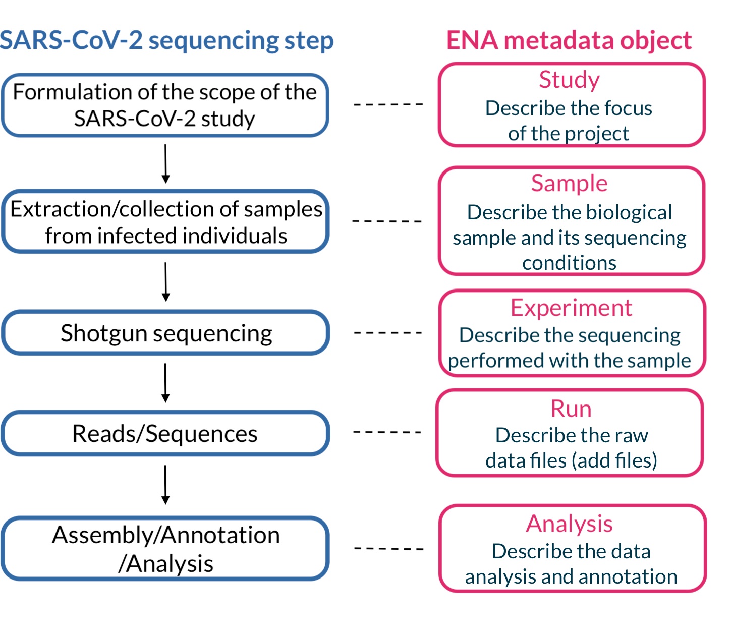 ENA recognises multiple ‘levels’/‘types’ of metadata related to sequencing projects. These different ‘levels’/‘types’ of metadata are represented by different metadata objects. For example, general project information (such as the project title) is defined in the study (project) object, sequenced source material is included in the samples object, and details about the sequencing experiment are captured in the experiment object.